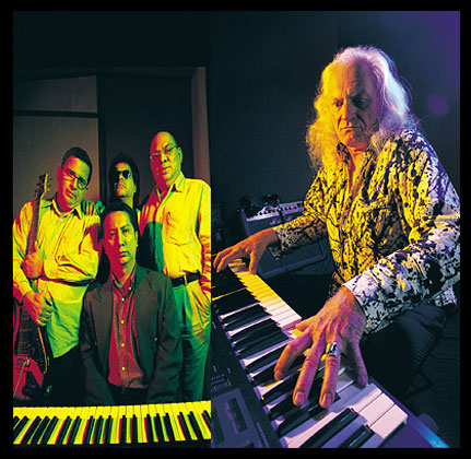 C’est évidemment dans une formule allégée par rapport à ses disques que COPERNICUS s’est produit sur scène. Il était pour ce concert accompagné du fidèle Larry KIRWAN (guitares, claviers, chant), qui endosse le rôle du sous-lieutenant avec toute la panoplie du musicien new wave très tendance, avec un jeu de scène « rebel » que l’on jugerait aujourd’hui stéréotypé, et une voix rappelant celle de Robert SMITH. Un autre guitariste, Mike FAZIO, le batteur Thomas HAMLIN et le bassiste Dave CONRAD (impressionnant) complétaient la formation, jouant bien plus que les utilités puisqu’on les voit déployer de généreux espaces instrumentaux tandis que le Maître ménage ses apparitions.