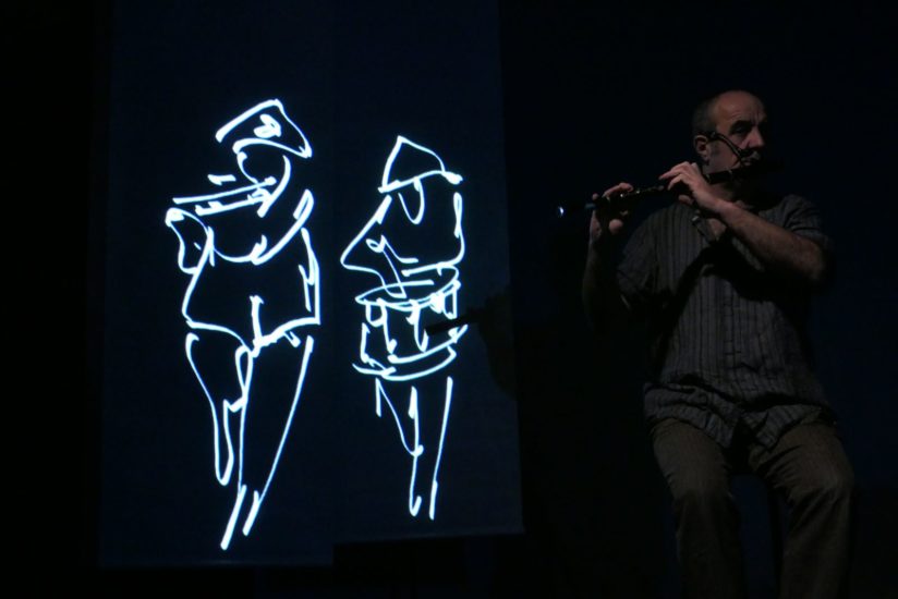 Et en 2015, je l’ai retrouvé ! Il m’a vu dans la rue, m’a reconnu tout de suite comme étant de SERENDOU – puisqu’on avait joué avec SERENDOU à Olinda. Je ne me rappelais plus de lui, mais très vite je l’ai vu sortir un crayon et je me suis dit « Mais c’est lui ! » Et du coup, je lui ai proposé une performance en direct entre lui et moi. Ça l’a stressé énormément ! Autant j’ai l’habitude d’être avec du public, autant lui, il est là avec son sous-bock et n’a que trois personnes comme public. Alors dix personnes pour lui, c’est trop ! Je l’ai rassuré, ça l’a beaucoup aidé et, en partant, il m’a dit : « La musique, c’est super important pour moi ! Et j’ai fait plein de choses sur une palette graphique avec des sons d’Egberto GISMONDI, Hermeto PASCOAL, etc. » Il m’a donné le fichier, je l’ai trouvé magnifique et j’ai décidé d’en utiliser un dans mon spectacle Oficina. J’ai composé un morceau, une sorte de « strathspey tropical » avec des a-coups, comme son trait de dessin. Il ne s’arrête jamais, il y a toujours du rythme dans ce qu’il fait, c’est très séquencé, comme ça…