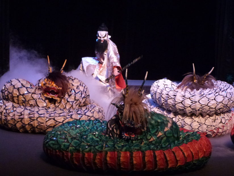 Dans la seconde pièce jouée par la troupe Kinshou Kagura ce soir-là, intitulée Yamato-no-Orochi, un dieu, Susanoh-no-mikoto, se met à combattre huit dragons. L’impact, tant visuel, théâtral que musical, est impressionnant !
