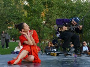 Vêtue d’un kimono rouge, Laureline MIALON a subjugué le public avec ses danses contemporaines japonisantes illustrant le partage des cultures à travers plusieurs thèmes musicaux, brillamment accompagnée par Gilles Bessou au luth.