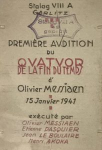 C’est dans ce camp, le 15 janvier 1941, que MESSIAEN donnera la première du Quatuor pour la fin du Temps, et voici le récit qu’il en fait : « Conçu et écrit pendant ma captivité, le Quatuor pour la fin du Temps fut donné en première audition au Stalag VIII A, le 15 janvier 1941. Ceci se passait à Görlitz, en Silésie, dans un froid atroce. Le Stalag était enseveli sous la neige. Nous étions trente mille prisonniers (Français pour la plupart, avec quelques Polonais et Belges). Les quatre instrumentistes jouaient sur des instruments cassés : le violoncelle d’Étienne PASQUIER n’avait que trois cordes, les touches de mon piano droit s’abaissaient et ne se relevaient plus. C’est sur ce piano, avec mes trois confrères musiciens, habillés de la plus étrange façon, moi-même étant vêtu d’un uniforme de soldat tchèque vert bouteille complètement déchiré et chaussé de gros sabots de bois permettant à peine la circulation du sang, que je jouai mon Quatuor pour la fin du Temps, devant un auditoire de cinq mille personnes où se trouvaient mêlées les classes les plus diverses de la société, des paysans, des ouvriers, des intellectuels, des militaires de carrière, des médecins, des prêtres et j’en passe. Jamais je n’ai été écouté avec autant d’attention et de compréhension ».