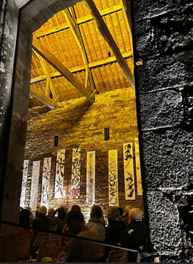 Le point d’orgue qui conclut cette journée est précisément cette évocation de la légende de la ville d’Ys, contée par Hiromi ASAÏ, conteuse dont la posture et la diction nous transportent instantanément dans une dimension féerique. Les étapes du conte sont émaillées, en écho, d’extraits de la Cathédrale engloutie de DEBUSSY joués au piano par Shiho NARUSHIMA. Retenant ses gestes, ses phrases, son souffle, Hiromi ASAÏ appuie son récit sur les longues tentures calligraphiées réalisées par Izumi KOHAMA qui ornent les grands murs de pierre de l’Orangerie. Le public, suspendu à ses mots, applaudit chaleureusement à cette évocation d’une légende mythique locale dont le thème fait également écho à l’épisode biblique du Déluge ou au mythe de l’Atlantide. L’esthétique extrême-orientale conférée à la légende révèle ici, outre la solennité inhérente au récit, le caractère universel des peurs humaines fondamentales, la crainte de la sanction divine, mais fait aussi l’éloge de l’aspiration à la beauté et à l’exaltation des sens dont Dahut est l’héroïne.
