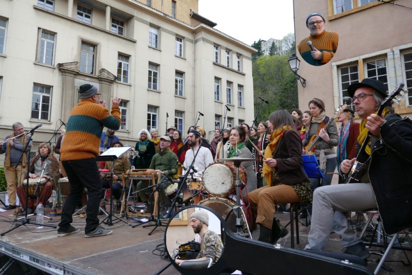 C’est ainsi que s’est produit, le 6 mai dernier sur la place St-Jean, le GOMA, alias le « Grand Orchestre des Musiques de l’Ailleurs », soit quarante chanteurs et musiciens amateurs conduits par Richard MONSÉGU et Sébastien TRON du groupe « intra-terrestre » ANTIQUARKS, avec la participation de Jean-Luc PEILHON aux shakuhachi, clarinette et harmonica.