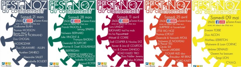 Le programme du dernier fest-noz du confinement #5 avec des live du Canada et de Belgique et bien sûr de Bretagne le samedi 9 mai (le déconfinement étant prévu le 11 mai, une surprise est annoncée pour la suite) :