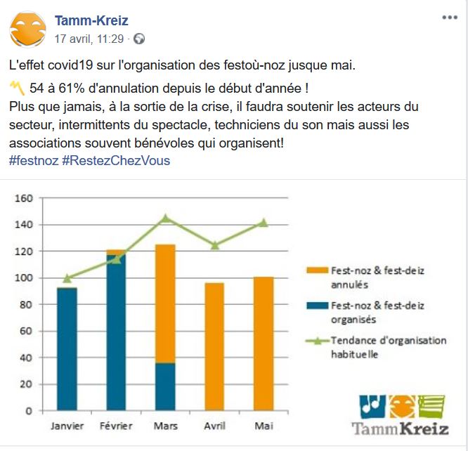 Du coup je profite pour faire d’autres choses, pour tester des idées, publier sur les réseaux, pour éditer des statistiques et des chiffres sur l’activité du fest-noz avec l’aide d’une de nos bénévoles Cécile GAYET. J’ai aussi pas mal de travail avec les fest-noz du confinement. J’ai toujours du travail mais je m’organise différemment!